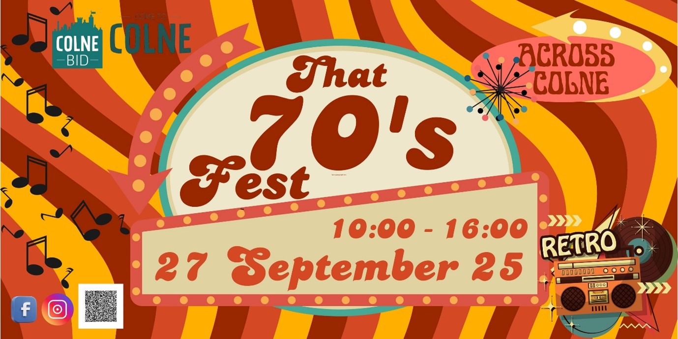 From flared trousers and funky beats to vintage cars and platformed feet; on Saturday 27th September 2025 between 10am and 4pm, Colne town centre will be transformed into a vibrant tribute to the most iconic decade of music, fashion, and culture.